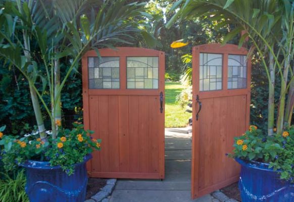 Prior to James taking over the vegetable garden, Tim experimented with vegetables, often incorporating plants into available niches in his flower beds. The purchase of a neighboring property enabled Tim and James to carve out space for a garden that’s totally devoted to growing vegetables and herbs. James, however, has literally taken growing vegetables to new heights by building trellises out of bamboo (on which tomatoes grow) and repurposing hoop houses (over which beans and other vine-type plants meander). “Up is gained space,” he explains. “By going up, you can maximize your space.” Indeed, it’s true here, as the garden seems to go on and on. But, as Tim and James point out, what seems to be a huge expanse is just an optical illusion.