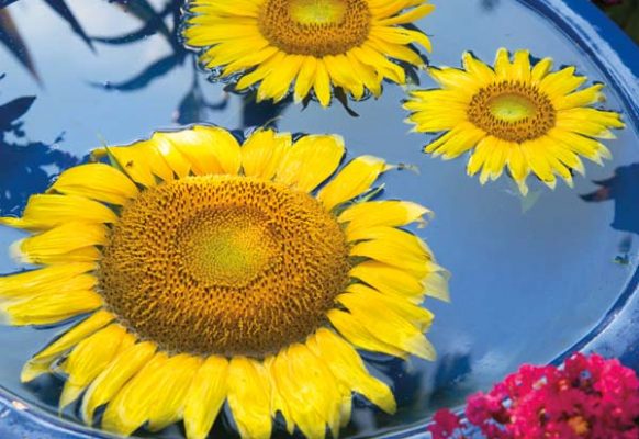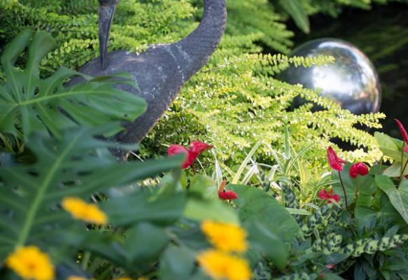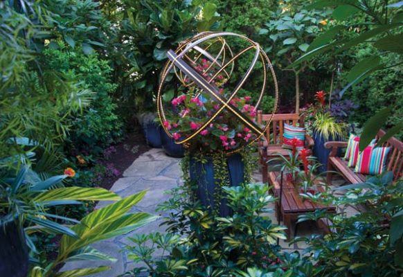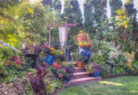 The backyard has undergone its own metamorphosis. When Tim bought the property (the house dates to the mid-‘70s), flower beds were nonexistent. “There were a lot of trees, though,” he recalls. Tim began the makeover by planting living privacy screens around the perimeter of the backyard. The deck off the kitchen area nearly doubled in size to 12×16 feet. Over the years, extensive, multi-level decking was added in order to create spaces dedicated to dining, relaxing and entertaining. Ponds were added. Houses for the resident peacocks and chickens were built. “We had ducks, too,” Tim adds. Lights illuminate the trees and walkways. Tim’s renowned container gardens abound. “I get started on them in mid-March,” he explains, noting that February’s mild weather prompted him to visit suppliers earlier than usual this year.