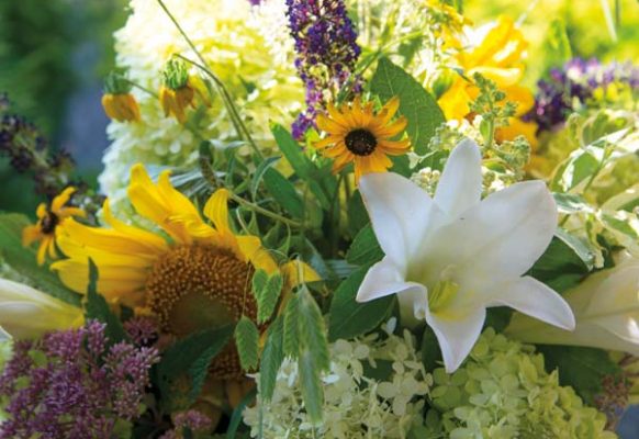 With a theme in place, Tim and James then designed the look of the party. Home-grown extended to floral design. Sunflowers, which Tim grew, abounded and were used in a variety of ways. Arrangements were composed of other floral finds from the garden. James continued the home-grown theme by designing a cucumber-based signature cocktail.