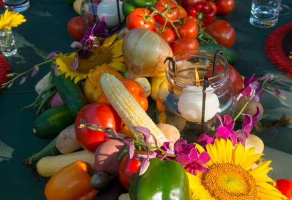 The tablescaping created a chorus of oohs and aahs as guests entered the garden. Tim says texture and layering were keys to creating this unforgettable look. The table was draped with a vivid green cloth that Tim obtained from Special Occasions. Its center was piled with a colorful array of flowers and vegetables out of which topiaries grew. Colorful chargers and floral-themed napkins (also from Special Occasions) denoted each seat at the table.