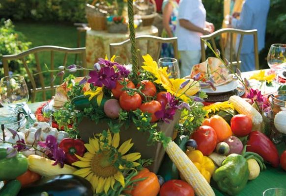 As the sun set in the west, the garden turned magical as lights illuminated the trees. “The weather was perfect,” Tim says of the break in the heat that occurred as if on cue. Guests, who were told to don “big hats and big jewels,” left with mementos of the party: A round table on the lawn was piled with baskets that guests could use to gather vegetables from the dining table and take home with them.