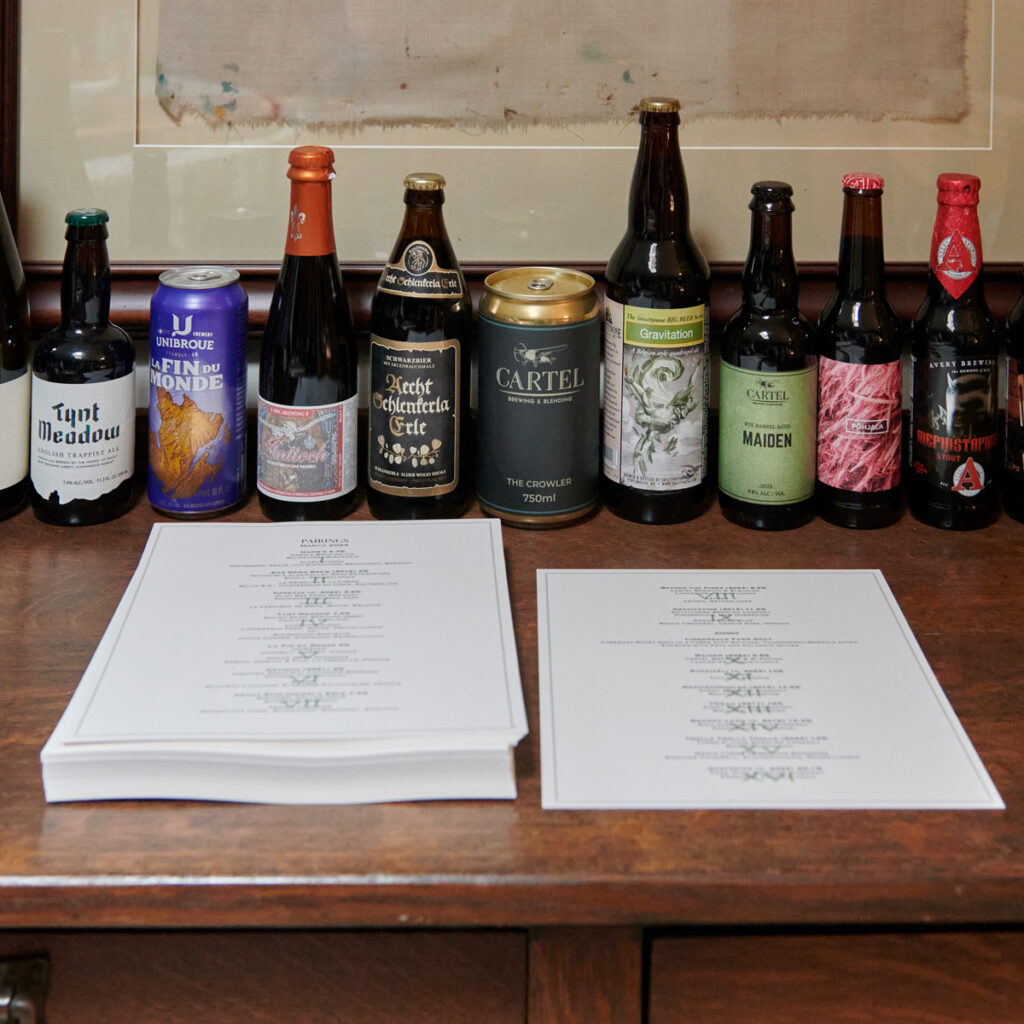 There are seven after-dinner beers. Most of these are from Bryan’s aging collection. At my table, where the guests have become jovial and splendidly opinionated on beers of their liking, the consensus favorite of the dark samples is Mephistopheles from Avery Brewing Company. Bryan dusted off a case he has been aging since 2016, right before the Boulder, Colorado brewery limited production of the malt-forward stout made with Westmalle Belgian yeast. But the biggest beer was saved for last. Dystopias from Free Will Brewing (Perkasie, PA) is a 20% ABV, barrel-aged strong ale. In 2022, Bryan picked up a couple cases of this beer from its first run and it now punctuates an evening filled with creative culinary selections and amusing merriment.