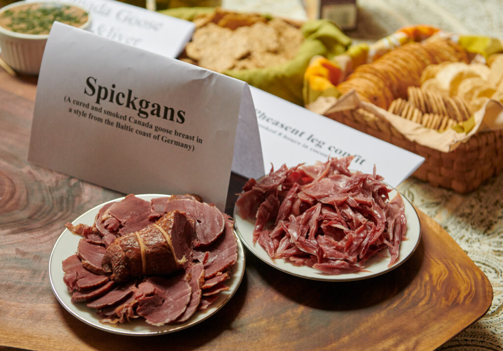 Appetizers, each year provided by Bob Dewar, included items such as goose liver pate, smoked Canada goose and Speckgans, cured/smoked Canada goose breast prepared in the style of Germany’s Baltic coast.