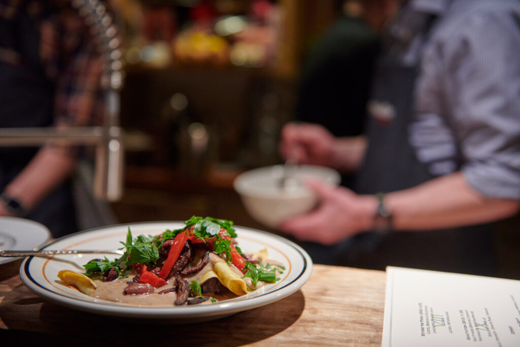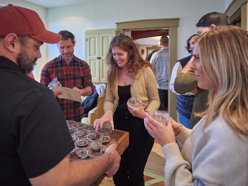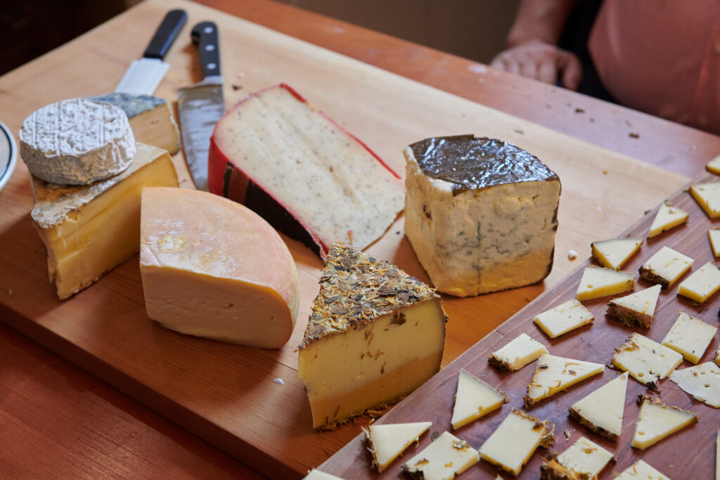 Fifteen cheeses, displayed on live-edge wooden planks across the dining table, hail from all over the world. The exercise in flavors allows the group to figure out how a smoked black lager from Germany is elevated by an English cheddar, or how a French sheep’s milk cheese bounces against the palate while drinking a Flemish red from Connecticut. The task of the evening is to consider guests’ palates, making sure not to “blow people out of the water” after the first of many pairings.