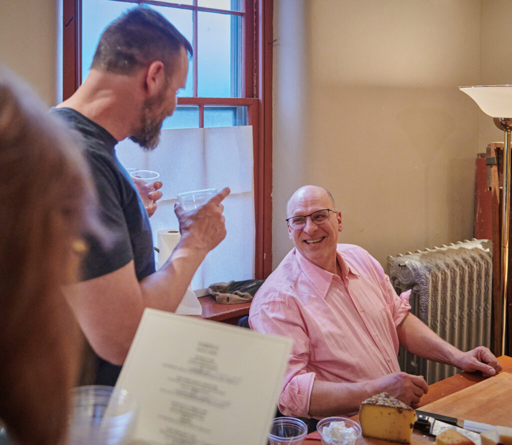 Most of the cheeses arrive with Bill Mandros, a party staple and “an enthusiastic collaborator,” added Bryan. Bill’s shop, Mandros Imported Foods on the corner of Lemon and Charlotte streets in Lancaster, handles between 125 and 150 diverse types of cheeses. A walking encyclopedia of fromage, Bill brings Michelin Guide knowledge with a working man’s disposition.