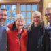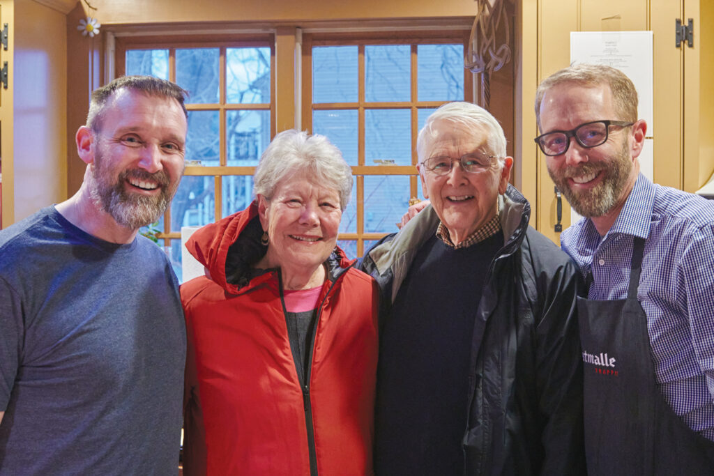 Bryan (left) and his brother, Tom, welcome their parents, Romaine and Tom, Sr., to the event. Mrs. Campbell always donates her crème de menthe brownies to the dessert course.