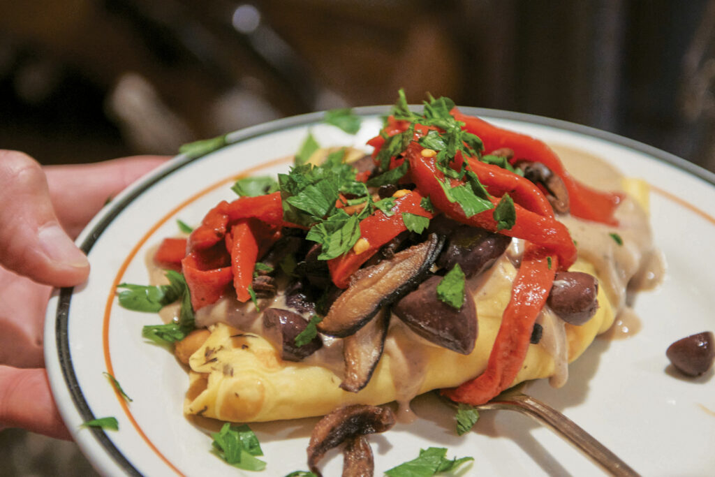 The main course: Linden Dale Farm goat crepes topped with mushrooms, olives, veggies, feta and a Chardonnay-Marsala sauce.