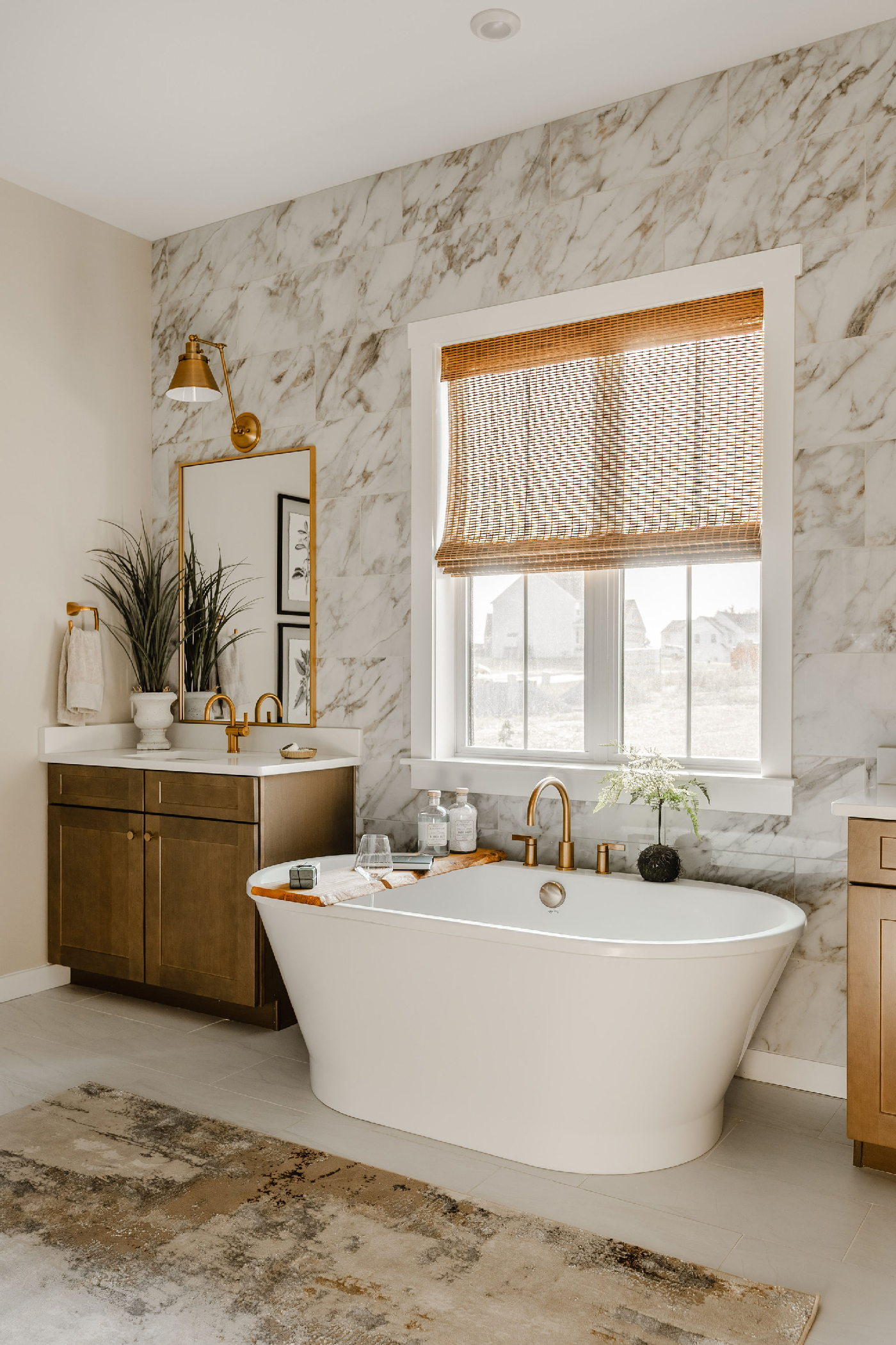 On Trend: First-Floor Primary Suite; Spa-like Bath; Gold; Marble Focus Wall; Getaway; Wellness
