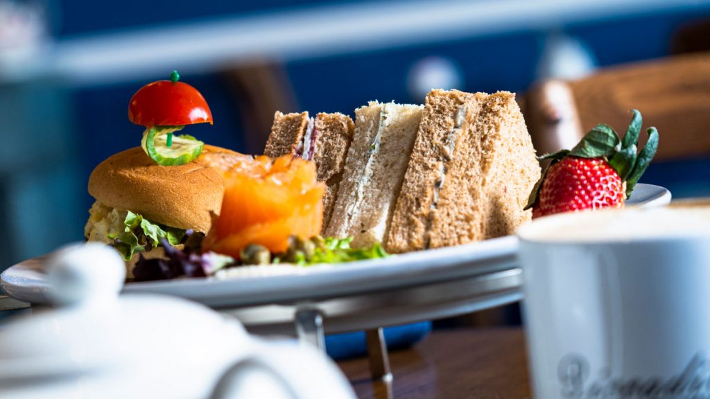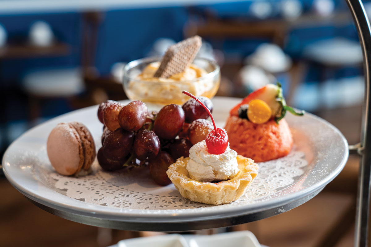 The Afternoon Tea tray features five varieties of finger sandwiches on the bottom tier. (Debora says guests may select the sandwiches for their tray.) The second layer features scones served with lemon curd, clotted cream, jam and butter. The top tier features tasty petite desserts. “Our scones are made in the traditional way – they’re round rather than triangular-shaped,” Debora explains.