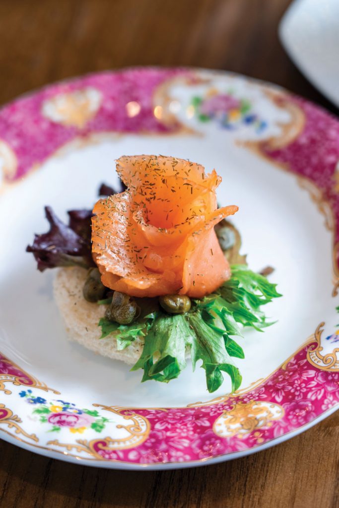Open since September 2018, the 42-seat restaurant has both a casual seating area and a more formal tea room. Dramatic color schemes denote each area. Large windows admit natural light. The casual seating area features tables, high-tops and sofas. “You can have a cup of coffee, a pastry and read a book. If you need a new read, we have a free library and are accepting books,” Debora says. The tea room’s more formal tone is distinguished by sparkling chandeliers.