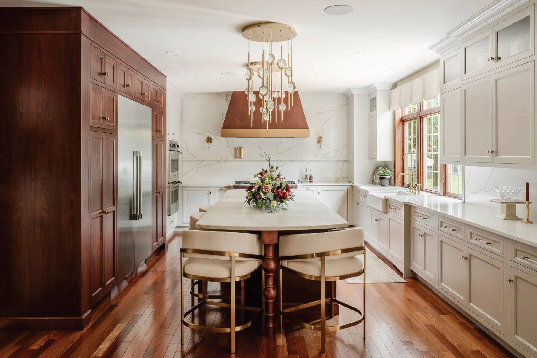 Cabinetry was designed in a mix of painted and stained cherry finishes. According to Invision’s lead interior designer, Amanda Voloshin, “We are seeing increased interest in warm wood-stained cabinetry again. We often suggest mixing paint and warm wood tones if the kitchen has a wood floor, especially if it’s a ‘busy’ one with multiple colors like Brazilian cherry that’s in the kitchen seen here.” Satin brass accents complement the floating shelves and custom hood, while satin bronze lighting and fixtures add a polished, classic finish. Thoughtful and clever storage solutions are integrated throughout: pullout organizers for spices, trays and cookware; a hidden-panel dishwasher; pop-up outlets; and a vertical-lift appliance garage that keeps the counters clear.