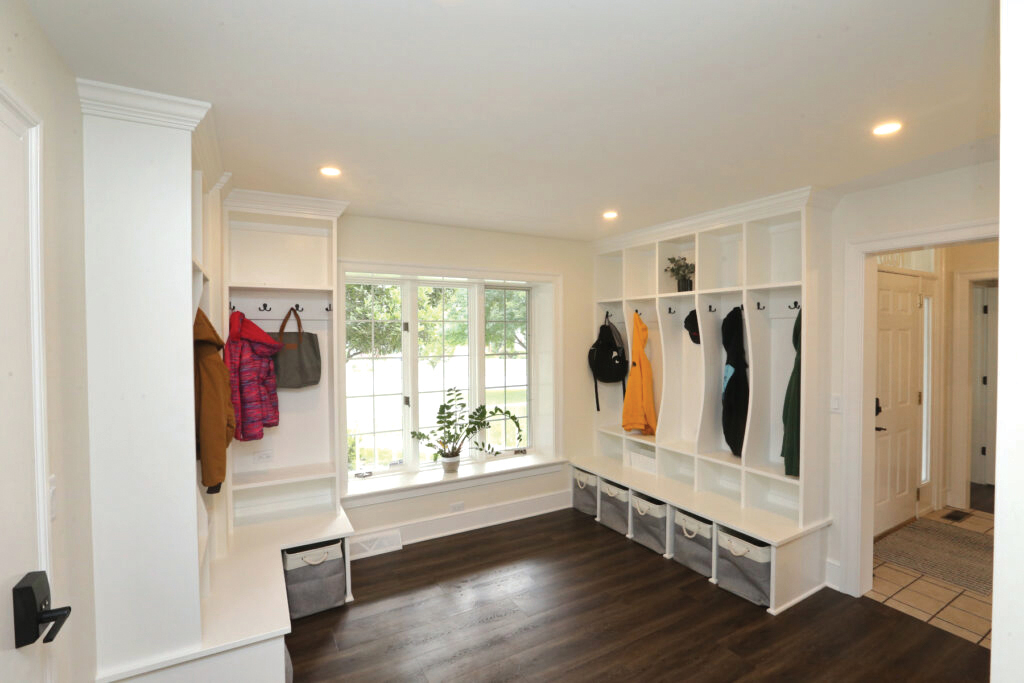 Meeting with Metzler’s addition-and-renovation team to discuss options for expanding their current home, the potential clients also expressed interest in having the company create a shared laundry, a large mudroom, a finished basement and outdoor living area. The To-Do list also included a renovated kitchen and pantry. According to Tim Zehr, Metzler’s addition and renovation advisor, “The mud room and pantry were significant focuses for these clients.” As a result, details such as cabinet doors that you push open to enter the hidden pantry and receptacles at each cubby in the mud room to charge devices figured into the spaces.