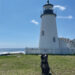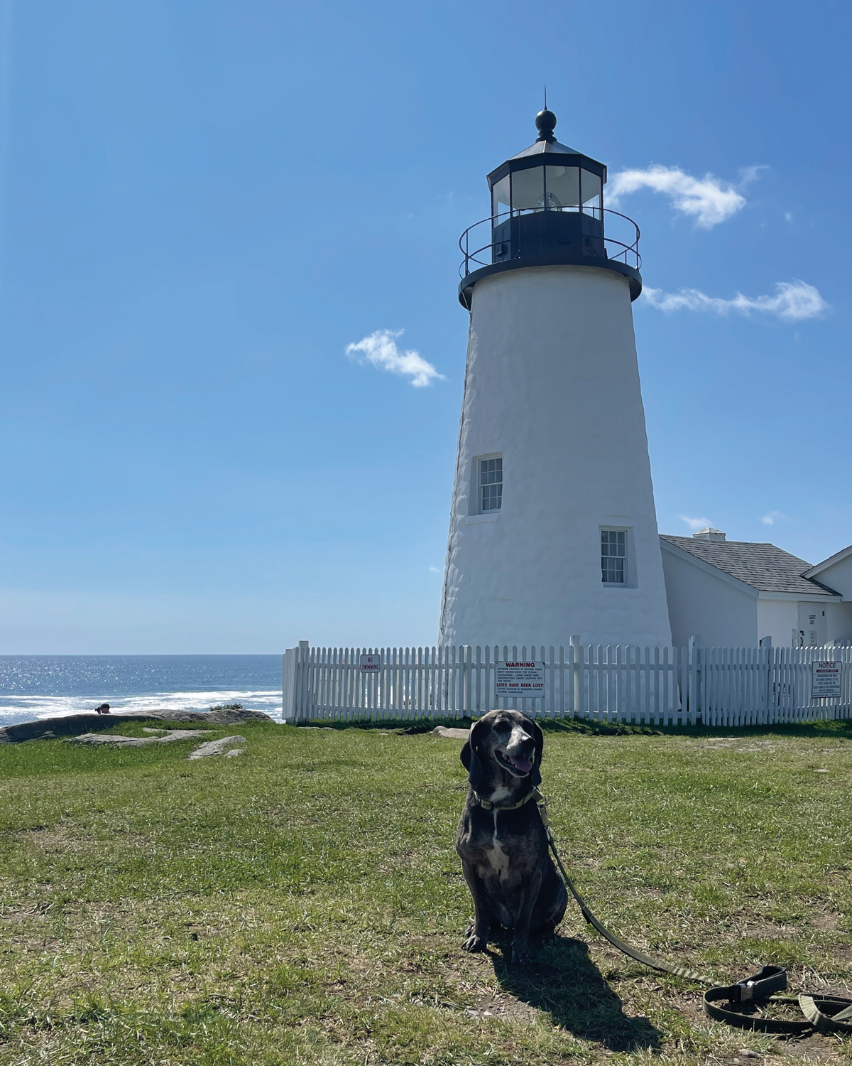 Outdoor landmarks are great destinations to visit when traveling with pets. Here, Piper poses in front of the Pemaquid Point Lighthouse in Maine.