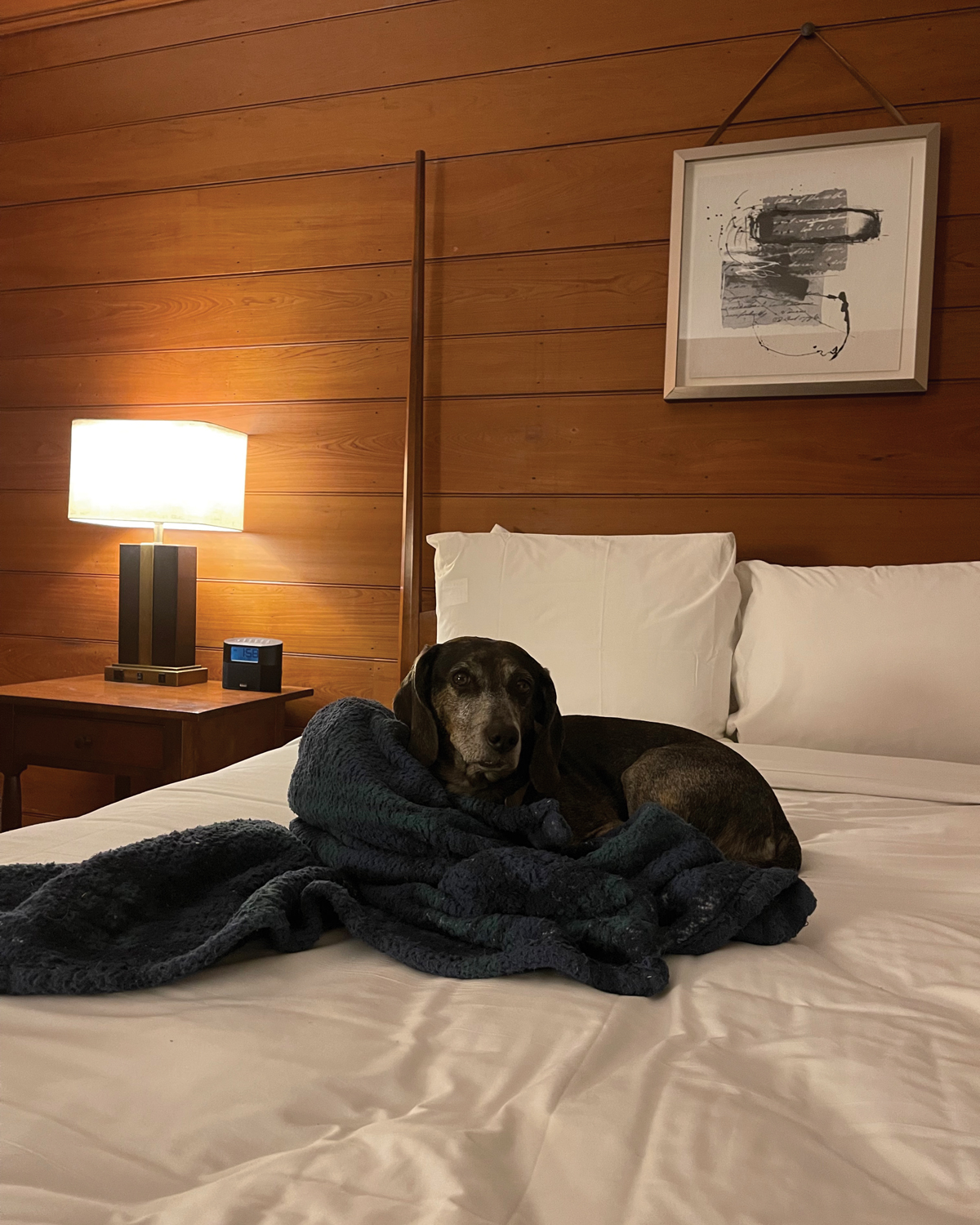 Staying in an unfamiliar space may cause a heightened sense of alertness in some dogs. I learned quickly that Piper was calmer when I brought a blanket or dog bed from home. Having something that smells like home and is familiar to your dog can help them feel comfortable in a new space. Likewise, to limit sound sensitivity, I often leave the TV on or pack a small FM radio to play music while I’m away, which helps muffle outside noises that may cause Piper to bark.