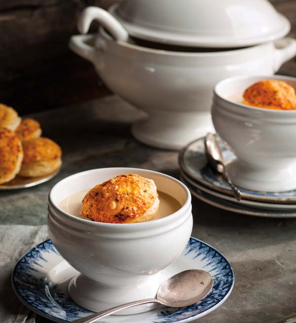 - Process mixture with a hand-held blender until smooth. Add cream and lemon juice. Return to low heat; simmer, stirring often, 15 minutes. Add salt and pepper. Serve with Cheese Puff Pastries.