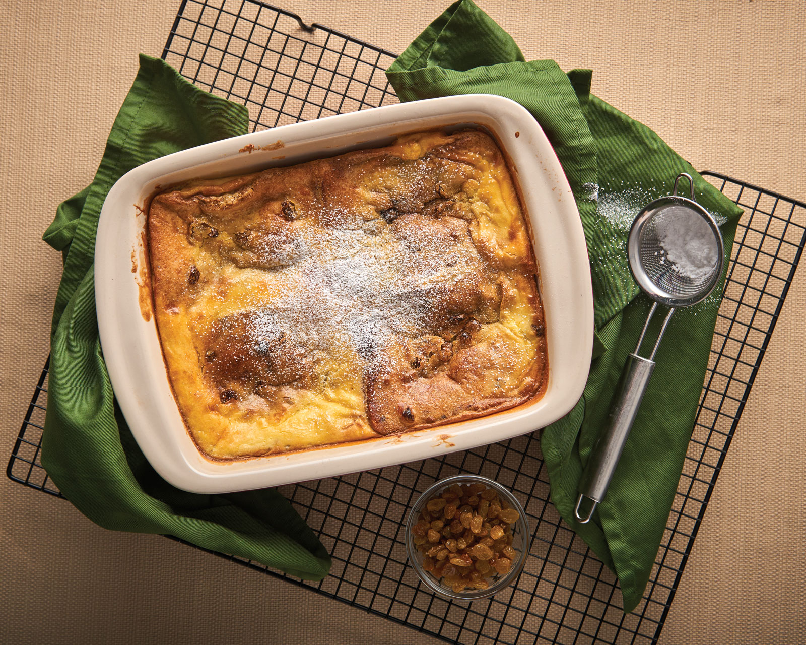 Bake the pudding in the preheated oven for 25 minutes, until golden brown and the custard has set. Before serving, dust with a little icing (confectioners') sugar.