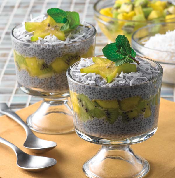 It doesn’t get any easier than this. Take a blend of coconut milk, cream of coconut and regular milk and stir in some chia seeds. In a few hours, the seeds will have swelled and thickened the mixture into a rich, creamy, textured pudding. When lightened up with some whipped cream and layered with tropical fruit, this dessert is not only healthy and easy to prepare, but also quite nutritious.
