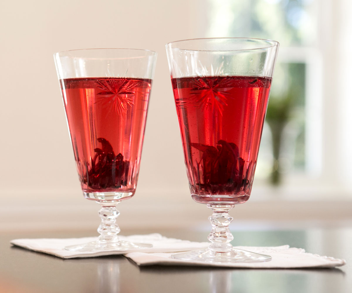 Place a hibiscus flower and some syrup (it’s sweet, so gear it to your taste) in the bottom of a glass. Place ice, vodka (2 parts) and St. Germaine (1 part) in a shaker. Shake and strain over a glass. Top with Champagne.