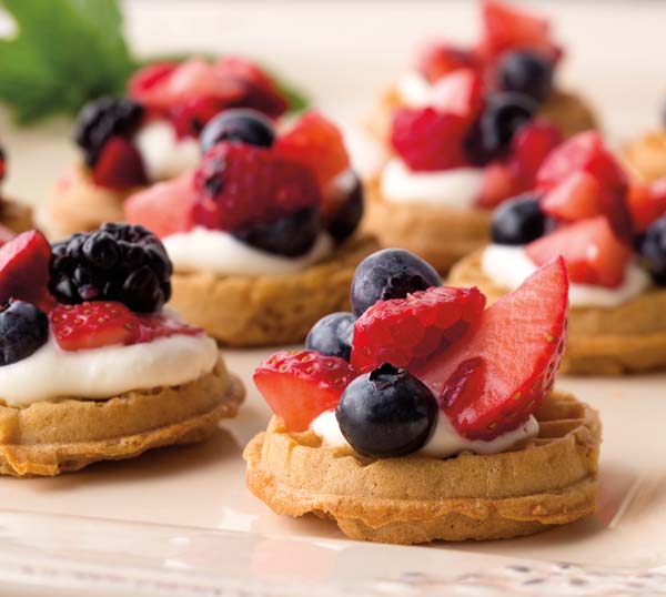 Makes 1 Dozen Here’s the perfect way to introduce fresh fruit and carbs to your Sunday brunch without overdoing it. These tiny two-bite beauties are semi-homemade, simple to assemble and easy to change up. Whether you stick with simple fresh fruit and rich whipped cream, or go in a savory direction, mini-waffles are fun with every bite.Ingredients
