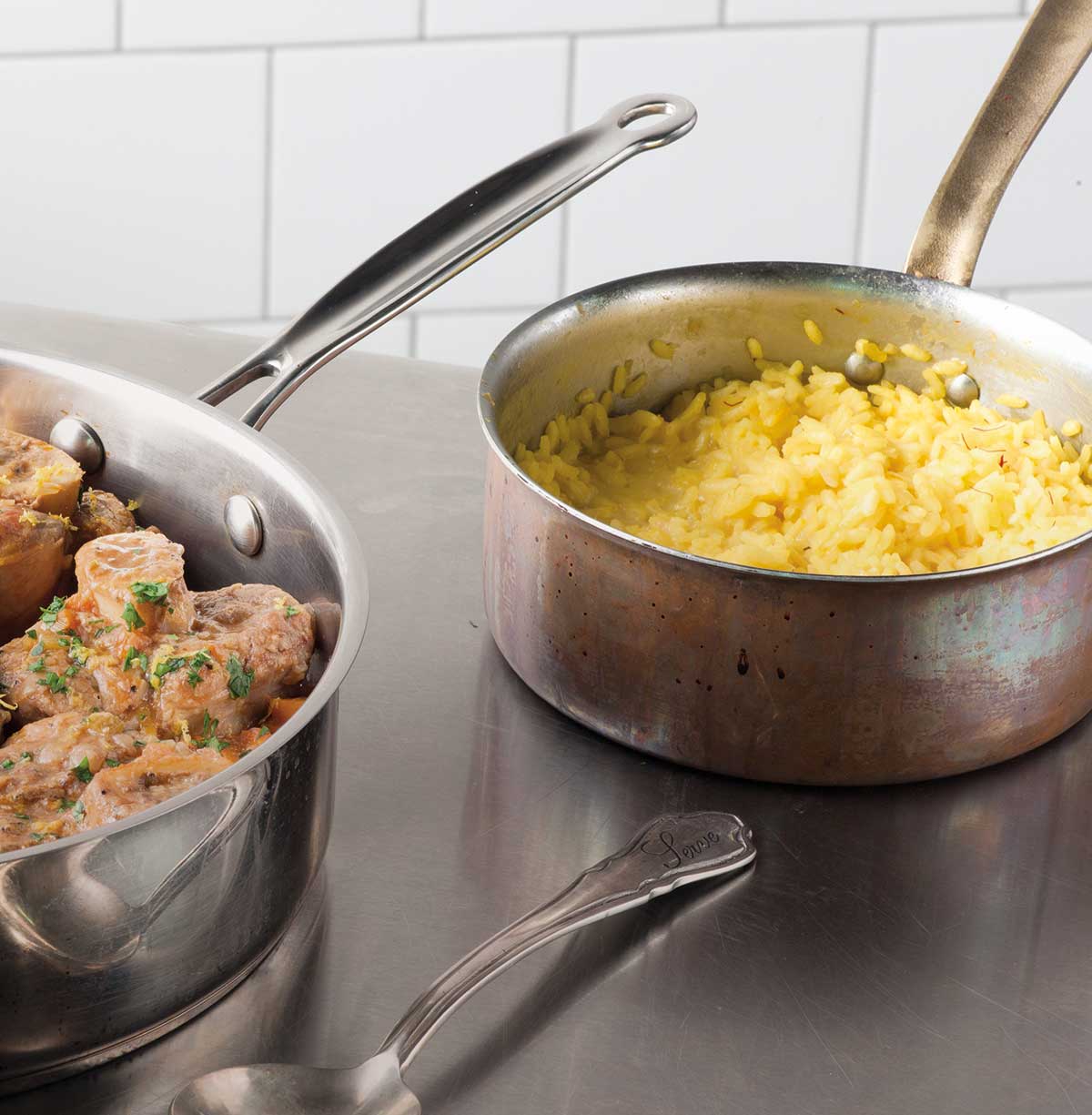 Risotto Milanese is a classic variation of risotto. This creamy rice dish is made with either the short-grained Arborio or Carnolini rice and, in this case, is flavored with saffron and Parmesan cheese. Although it’s worthy of being served as is, the dish begs to be served alongside rich, falling-off-the-bone meats such as the classic pairing: Ossobucco or braised veal shanks.