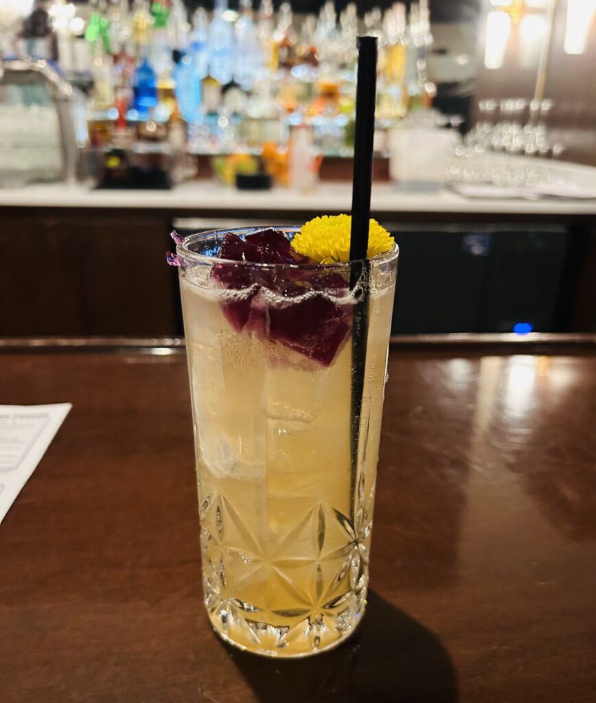 Lavender Elixir … lavender and honey Earl Grey and fresh lemon are topped with seltzer and butterfly pea flower gelatin and garnished with button flowers. Who needs alcohol! OK, you can add Tito’s and make it a bona fide cocktail.