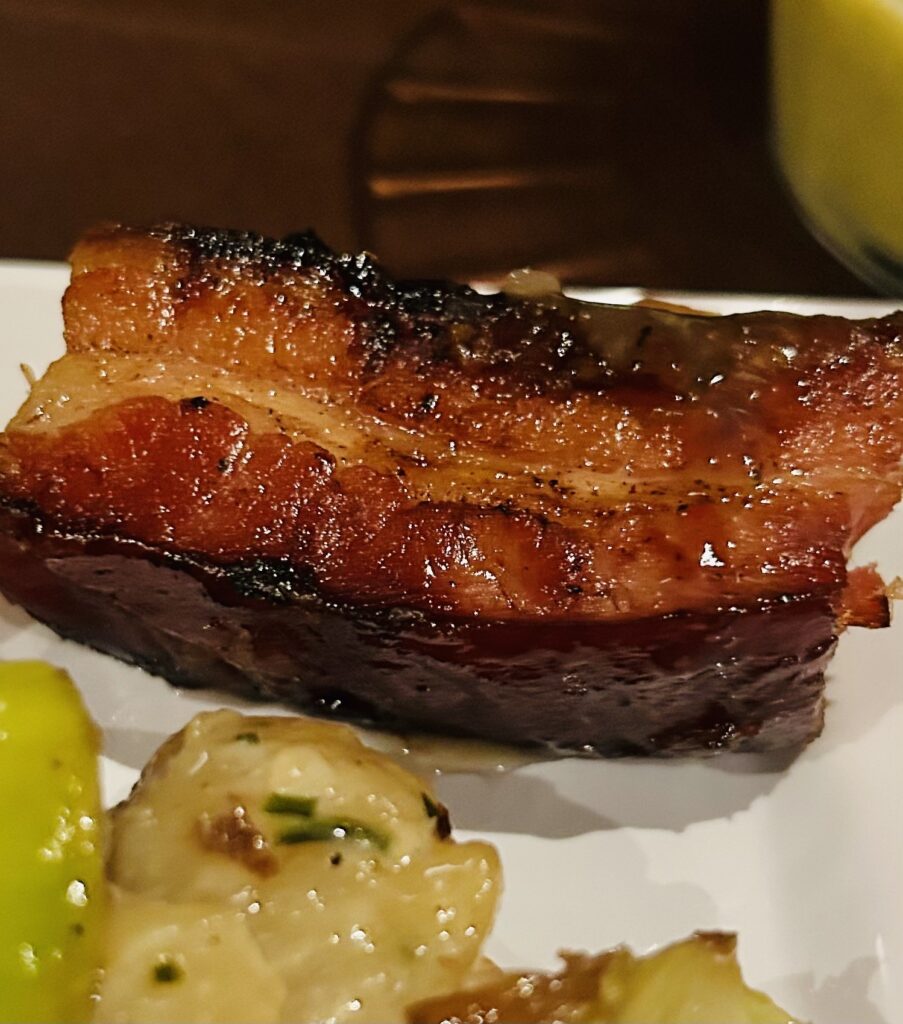 Triple cut miso bacon … Nueske’s applewood smoked bacon, Riesling miso glaze, pear & golden raisin chutney. There’s nothing left to be said except perfection.