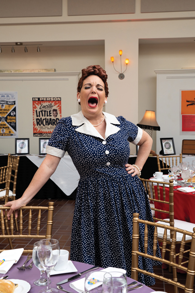 Arriving guests, who were encouraged to dress the part of a 50s prom-goer, were met on Prince Street by actors portraying James Dean and Gidget, hanging out next to a classic convertible whose radio was blasting hits from the 50s. Much younger actors were playing hop-scotch and jacks (remember those?) on the sidewalk. Still others were doing the Stroll (remember that?). Guests also passed by a hula-hooping babe as they headed for the Ware Center to mingle with more actors dressed, coiffed and in character as Marilyn Monroe, Dean Martin and other famous faces from the 50s. Of course, Marilyn entertained with her signature Diamonds are a Girl’s Best Friend, while Dean charmed at the bar with his pal Frank Sinatra. Carmen Miranda danced, and a young Gene Kelly glided around the dance floor.