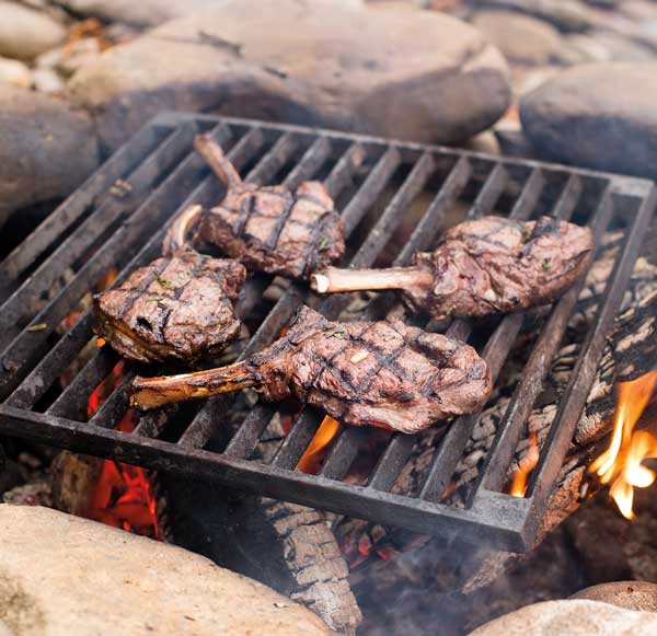 When rubbed with a touch of olive oil, fresh herbs, garlic, a little citrus and vinegar, the chops can be grilled over a simple rock-rimmed fire, with a grill grate set atop the ashen wood. I used what is called a Tuscan grill, which is a heavy-duty, cast-iron grate with legs that happens to give nice, thick marks for added seared flavor. It doesn’t twist and contort with the heat, and can hold the weight of quite a few of those tasty “tomahawks.” Steven Raichlen, of Barbecue University and Primal Grill fame, has one available through his online store: Barbecuebible.com (or through Amazon.com). A few minutes on the grill, a few well-timed turns and just a little steak-grilling know-how, and this is one cut that is sure to please.