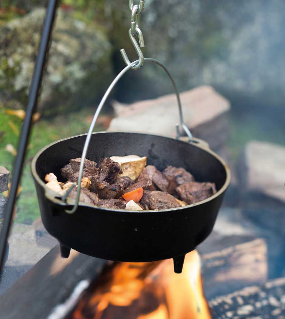What makes it even better is the rig that we cooked it on: a Dutch oven on a tripod, suspended by a chain over an open camp fire. What’s not to love about that?