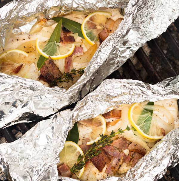 One of the best and easiest ways to prepare fish outdoors is in aluminum-foil parcels. Top the freshly fileted fish with various aromatic ingredients (in anticipation of catching the fish, I fried up some bacon and onion on the fire and added some fresh thyme, a bay leaf, a little lemon, salt and pepper) and crimp the foil packets, then onto the fire they go. After a few short minutes, the juices release from the fish and mingle with the other ingredients. Steam is then generated, the foil puffs up and in no time, it’s time to dig in. It doesn’t get any easier than that!