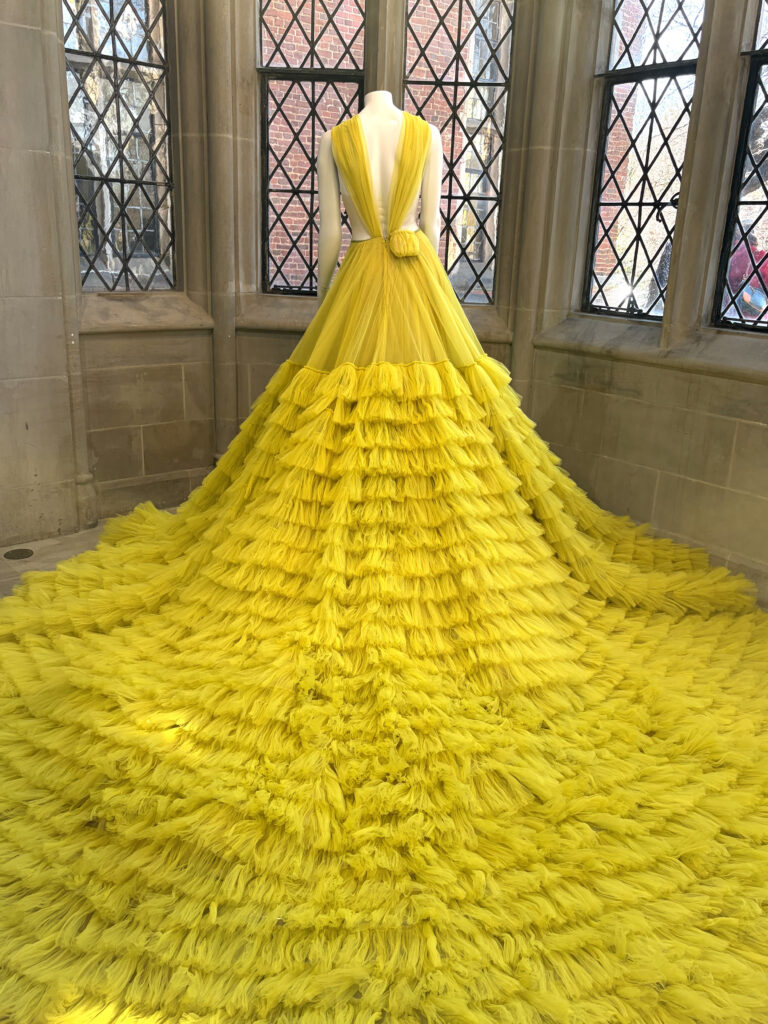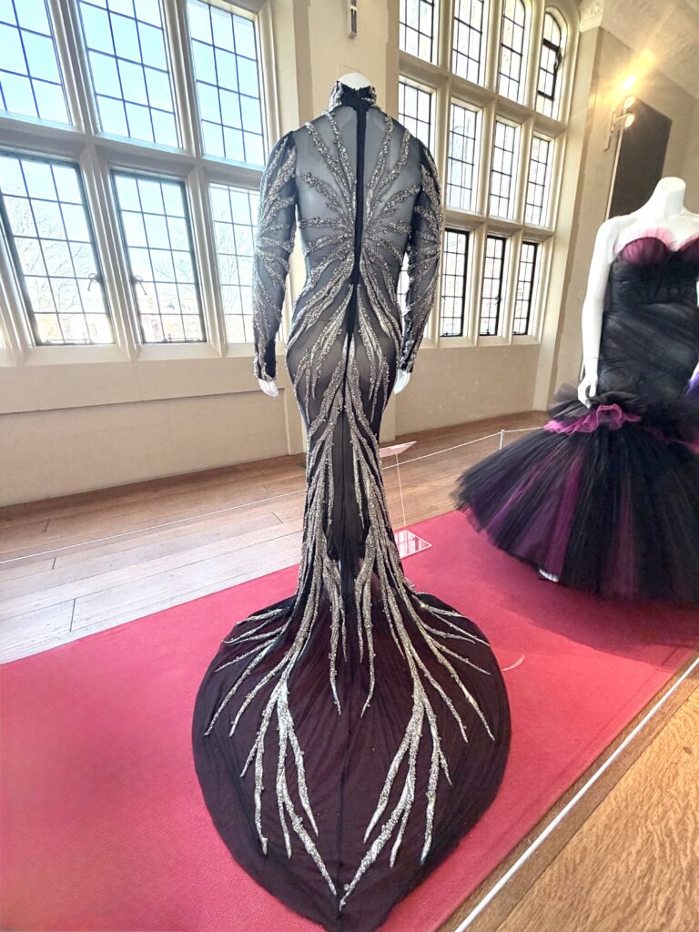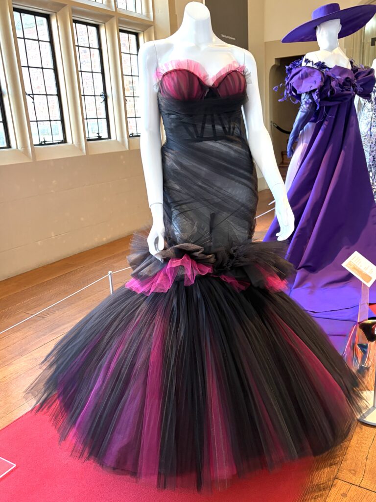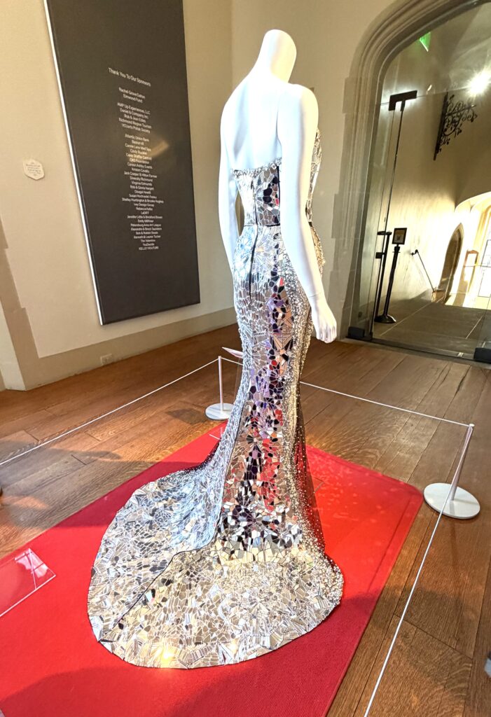 Cavallo shared some interesting stories about the gowns seen in the exhibit, which Siriano curated himself by reaching out to clients and asking if the dresses he designed, and they now own, could appear in the show. (He retains ownership of some of the gowns.) Halle Berry’s gown is amazing. She wore it to the Academy Awards in 2025. Siriano designed it to honor the fact that she had broken the glass ceiling by being the first Black woman to win the Best Actress Oscar for Monster’s Ball in 2002. Composed of 7,000 pieces of broken glass, the shimmering gown weighs 30 pounds. Cavallo explained Berry was happy to share the gown but there was a problem. During the “crush” of the red carpet, the train had been stepped on numerous times and was heavily damaged. Siriano instructed her to send the gown to him and he would make the necessary repairs. It’s a showstopper!