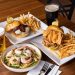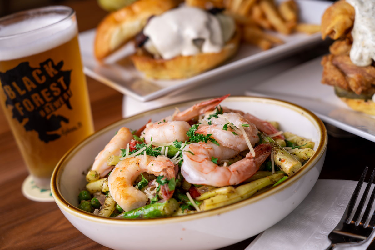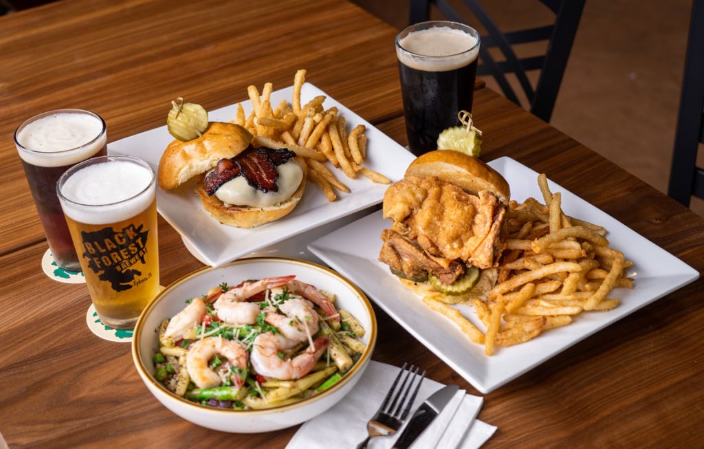 The menu features small plates (including fresh seasonal salad and fish and chips); large plates (filet tips, mac & cheese bowl and grilled vegetable grain bowl); shareables (such as Buffalo chicken dip, macho nachos and fried drumsticks); and handhelds (including Black Forest Brewery hot dog, BFB burritos, hot mess cheeseburger and fried chicken sandwich). Weekend specials are also offered.