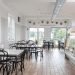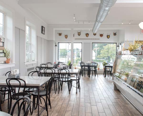 Located behind the display cases, the glass partition offers a view of the production area. White subway tile distinguishes some of the walls. Tall windows bathe the cozy dining area with natural light. The BYOB café seats 28 at wood tables of varying sizes. The larger tables sport marble tops. “We wanted to create a crisp, clean look and a casual, comfortable restaurant,” says Kristina.