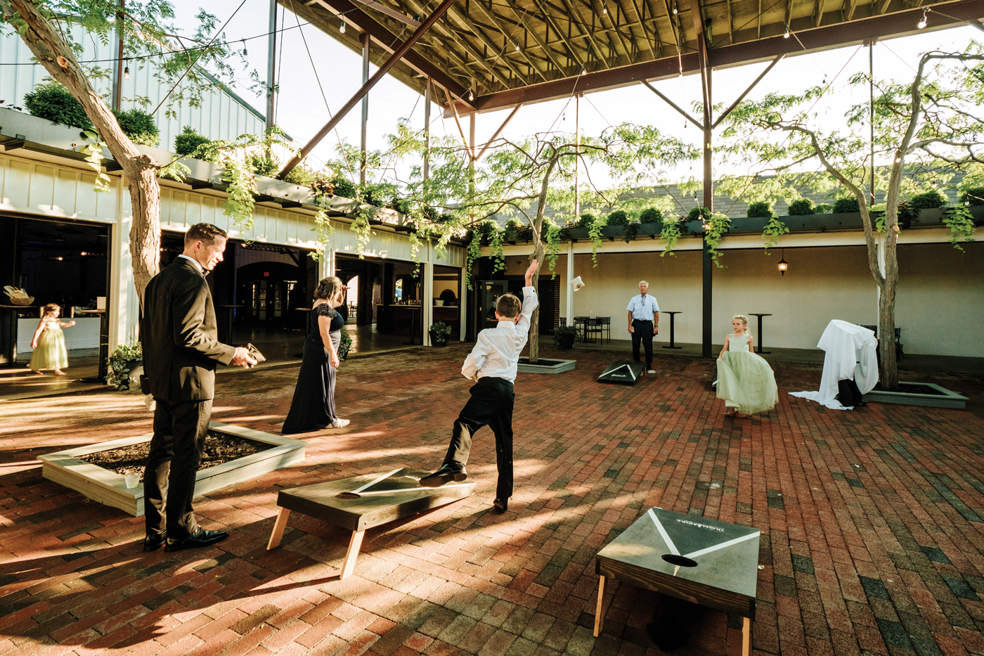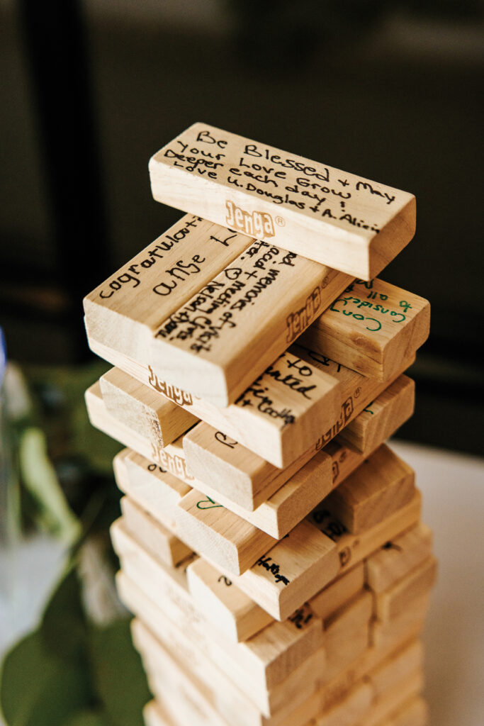 At Savannah and Chris’s wedding, that began with a unique guest check-in that invited attendees to write endearing messages on Jenga blocks and add them to the growing tower of blocks. Guests could also engage in cornhole.