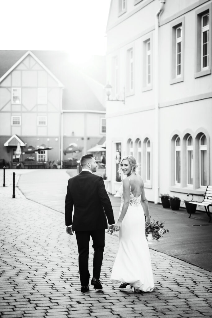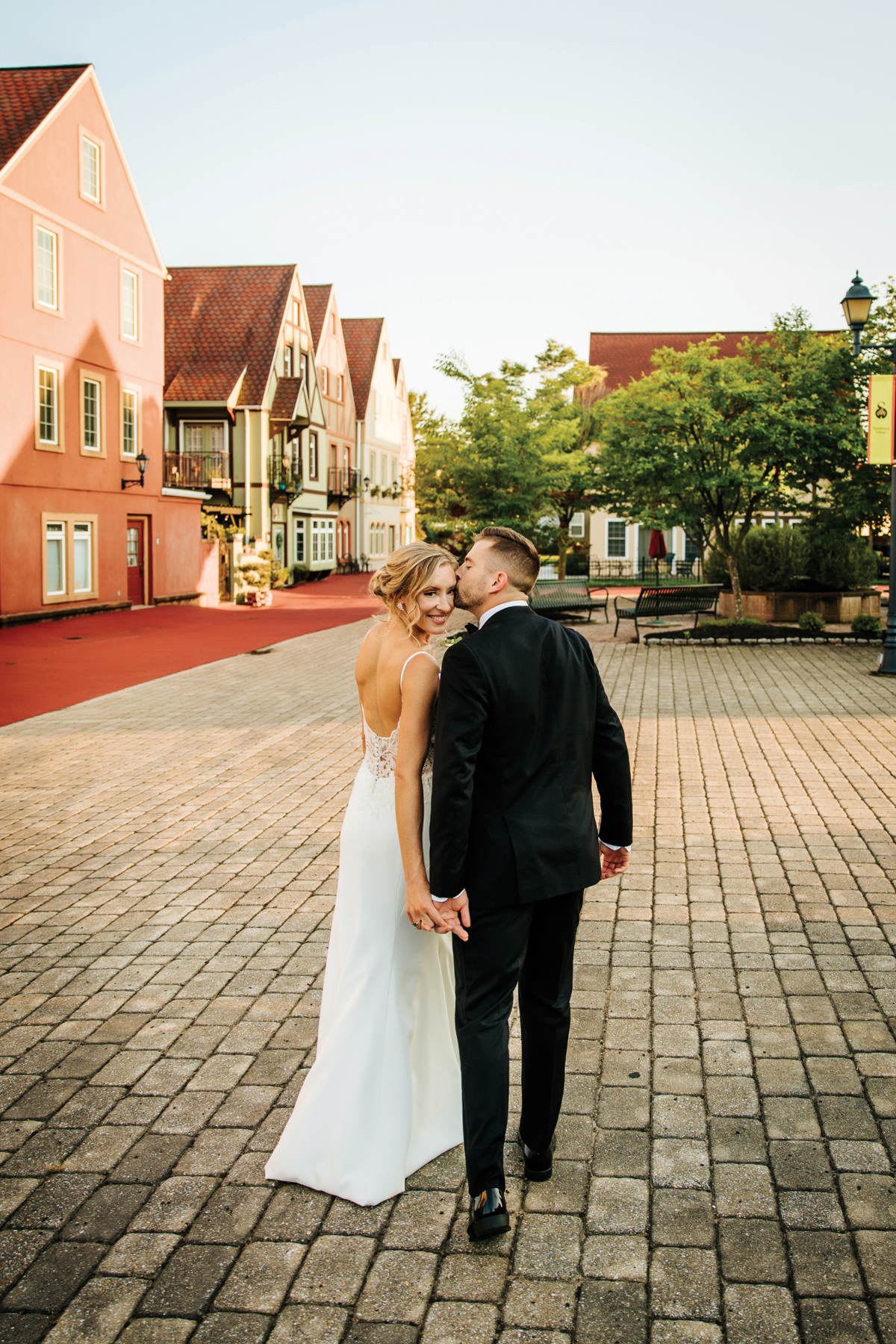 As for food, Catering by John Lowe handled that aspect of the wedding, which included passed hors d’oeuvres and a buffet dinner. “They make you feel so special,” says Savannah. “The food was delicious, and the service was incredible.” They also liked the fact that the company donates leftover food to charitable organizations. Dinner ended on a sweet note with a small wedding cake (red velvet) from La Dolce Vita and desserts from Costco. After dinner, the newlyweds and their guests danced the night away. The two did steal away for photos at the neighboring Stoudtburg Village.