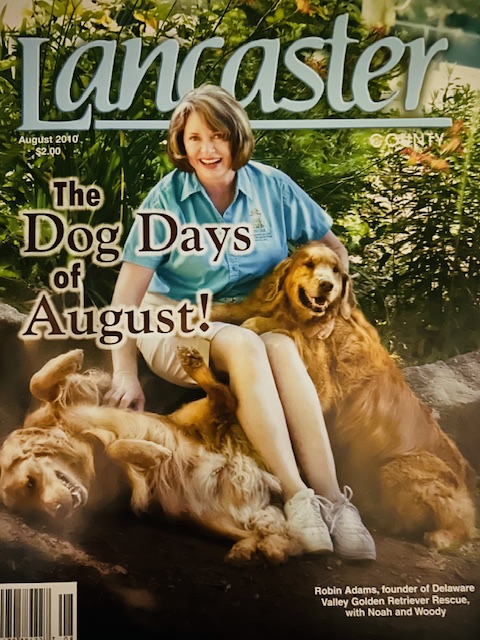 Delaware Valley Golden Retriever Rescue, August 2010: Founder Robin Adams posed with Noah and Woody on the grounds of the Denver-based rescue.