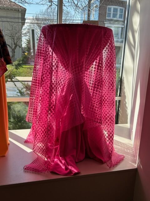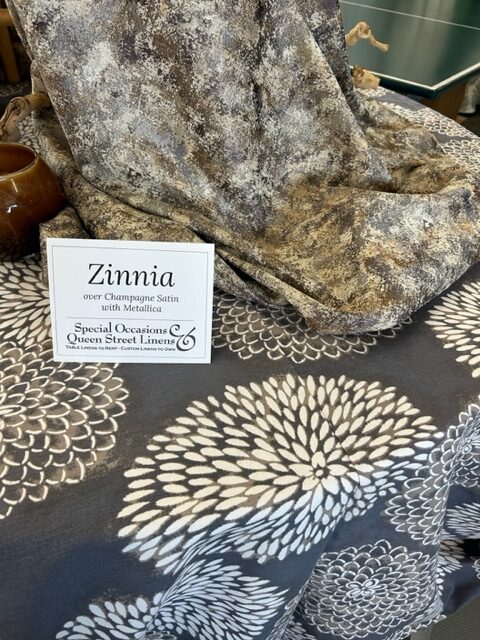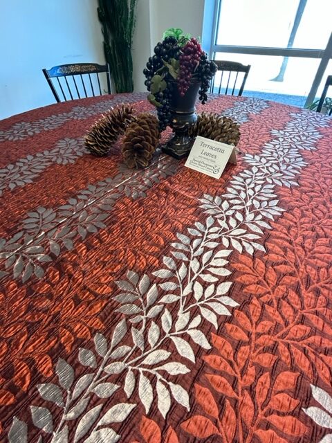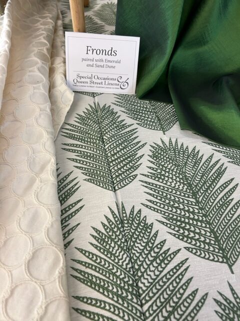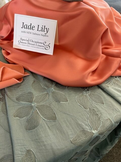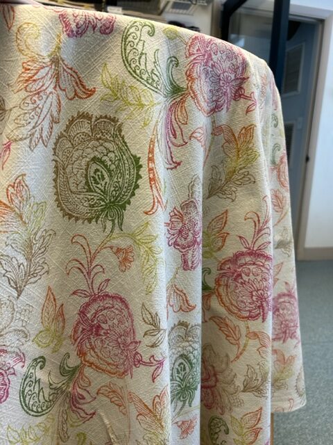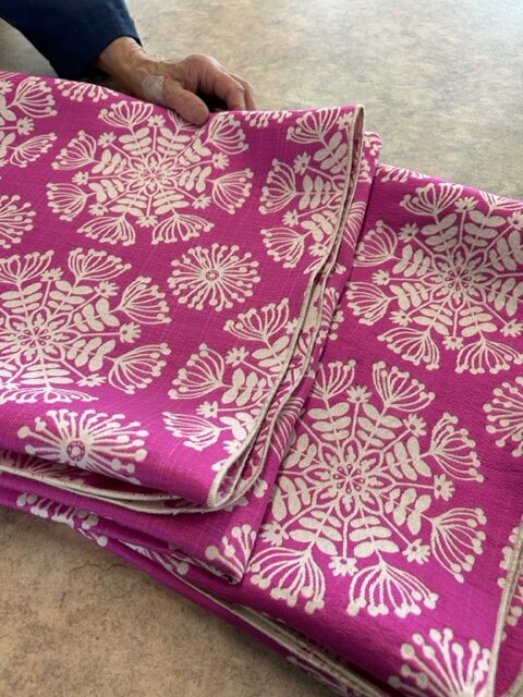 Bev welcomed visitors to an Open House at Special Occasions in late March. The event was held to introduce guests to Special O’s newest fabrics and the latest trends in dressing a table. Because of the pandemic, supplies had been limited due to manufacturing shutdowns and supply chain issues, but new fabric is now arriving. Two themes were obvious: nature and our continuing love affair with the color pink. Specialo.com