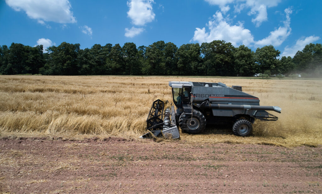 Cumulus clouds cast mid-day shadows on the farmland as Eric Steigman harvests spelt with a Deutz – Allis R60 Gleaner. Harvested spelt moves through the system with a massive auger into the hopper for temporary storage. It will later be transferred into a grain trailer to return to the mill.
