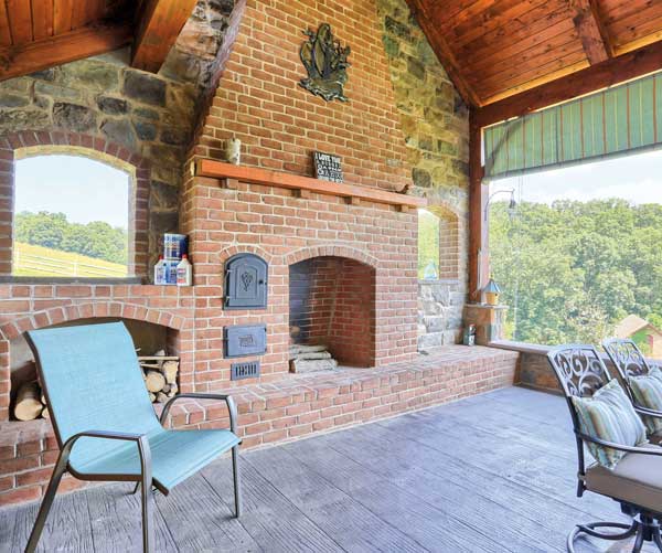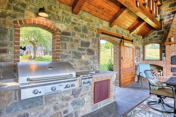 The open-air building looks as if it could be a repurposed farmhouse. Composed of brick and stone, the 18×25-foot structure is outfitted with a kitchen, fireplace (with ovens for making pizza and smoking meat), dining space and sitting areas. A soaring peaked ceiling adds to the spaciousness of the structure. Open doorways provide access to the grounds and adjacent patio. The back of the structure is partially open, providing a panoramic view of the pond and surrounding countryside. The stamped-concrete floor resembles wood planks you would see in a barn. “If there was a project that called for it, it was this one,” says Fred, noting that the overall design made both parties happy. “The design bridged the gap of their ideas,” he says.