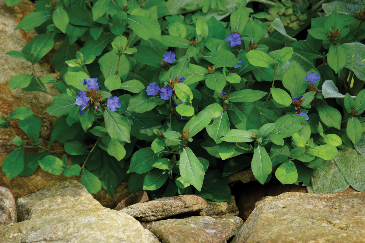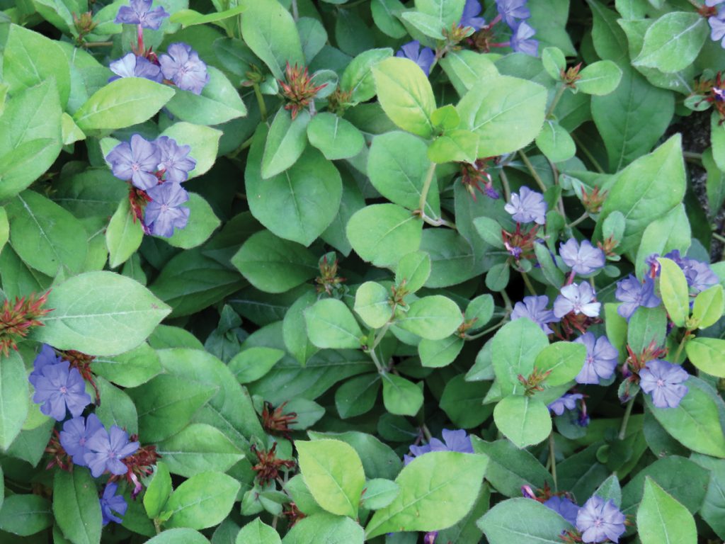 Culture: Another underappreciated and underutilized 6- to 10-inch groundcover that will do well in any average, well-drained soil in part shade. Commonly called “plumbago,” it will take full morning sun but should have afternoon shade in our area. It spreads underground to form expanding mats of shiny, medium-green foliage.
