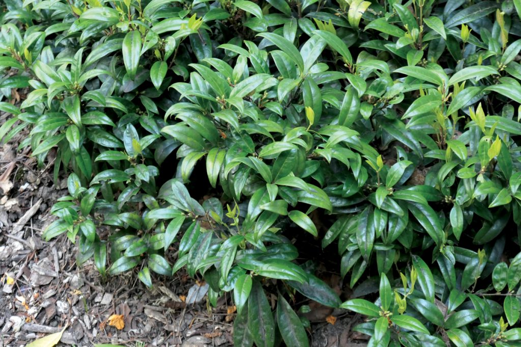Appearance: Sarcococca is in the same family as boxwood but doesn’t look anything like it. The lance-shaped, leathery, shiny dark-green leaves (3-1/2-inches long and 3/4- inch wide) are evergreen on stems that are a foot or more tall. In late winter, the barely noticeable flowers appear at the base of the leaves. Berry-like black fruits follow.