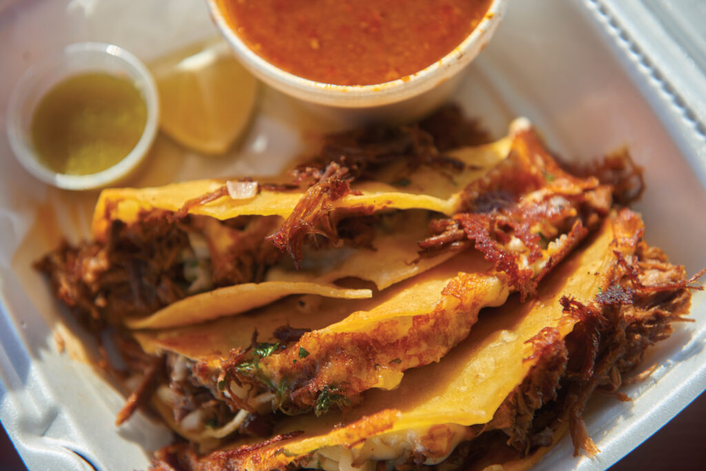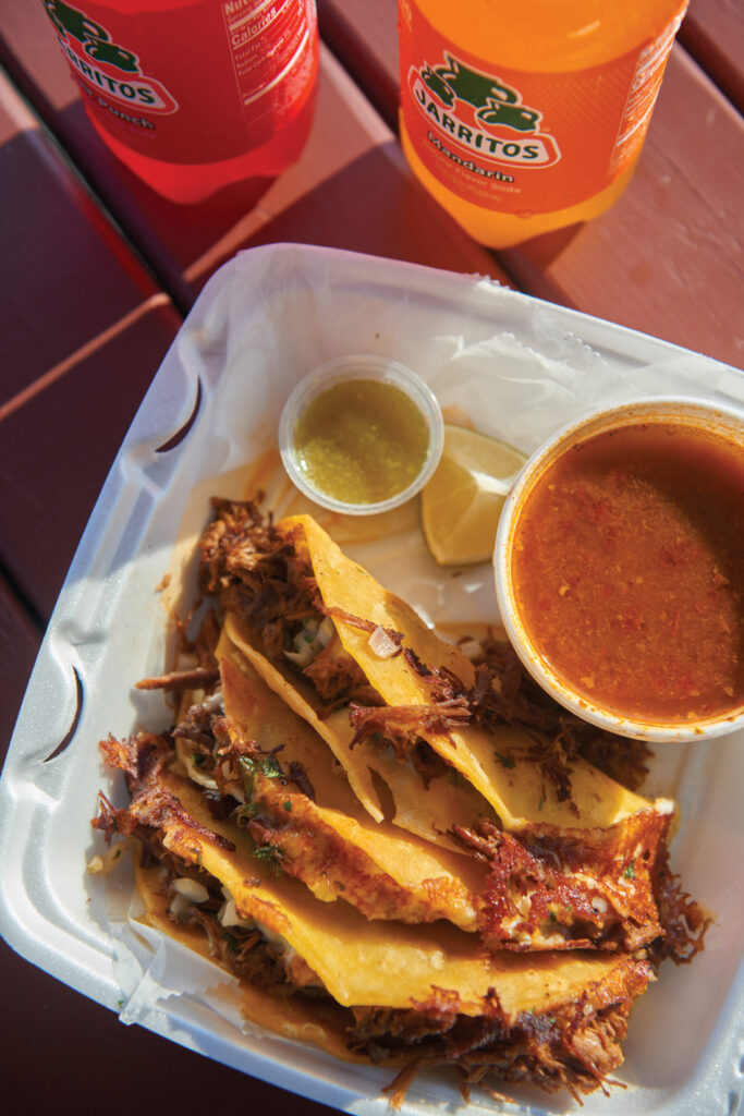 A real crowd pleaser at Tacos El Gordo is the Quesabirria: three shredded beef (birria) tacos, cheese, cilantro and onions, served with a cup of consommé, lime and salsa verde. Dipped in the savory consommé, the tacos are crunchy, chewy and dripping with flavor.