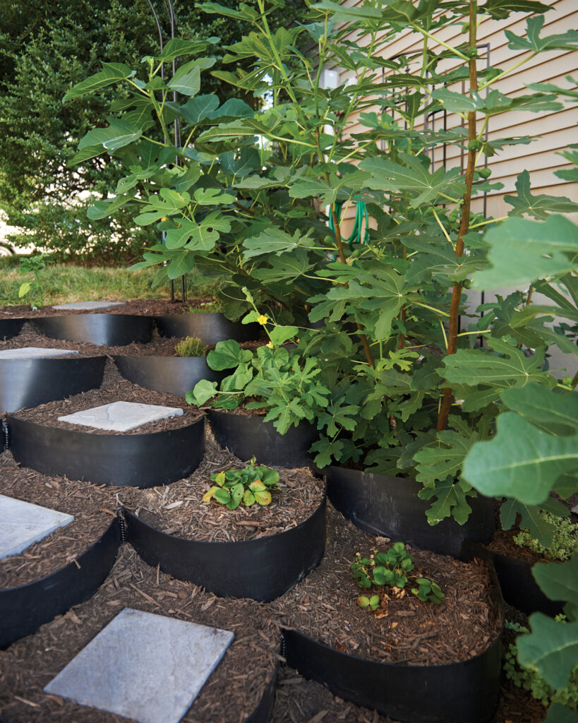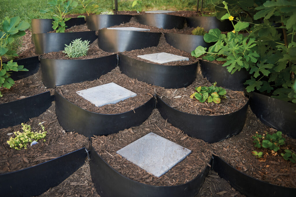 Traditionally, terraced spaces are costly and labor-intensive since they are created with stone or railroad ties. Unfortunately, the latter eventually rot and are usually coated in tar. Both are susceptible to issues with drainage, freezing and maintenance. However, an innovation known as Dirt Locker® caught my attention. Made in the U.S., using recycled plastic, these cells interlock to form a grid held in place with rebar J-hooks. Filled with soil, they can be installed on slopes up to 45 degrees.