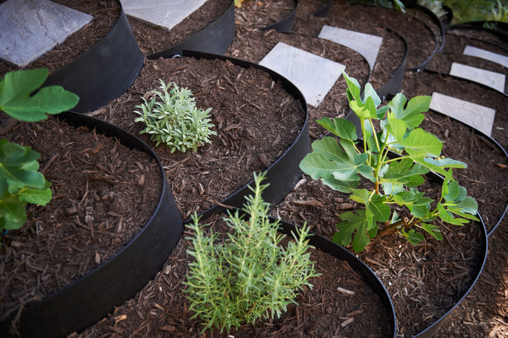 The trees are spaced towards the perimeter of the garden for airflow and light. The Dirt Lockers add warmth to the roots, a key element for productivity. Last fall, our maple tree dropped leaves while the fig trees were still green.