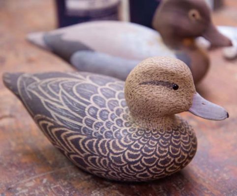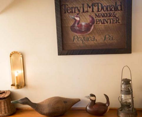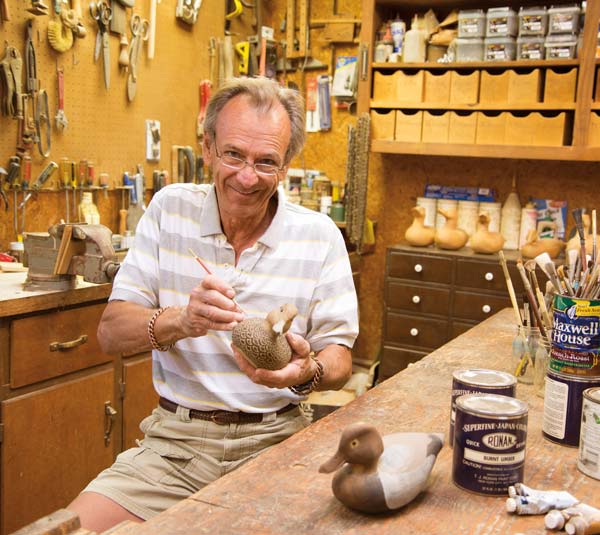 He also renewed his fascination with decoys and began crafting his own. His love of decoys extends back to childhood, as his family hunted and maintained a duck blind on the Susquehanna. “As a kid, I used to make them with my dad,” he explains. “Decoys intrigued me because they entail shape and are three-dimensional.” He returned to the hobby in 1989. “I was scared to paint them, so I had someone else paint my first one,” he explains. He then decided to conquer his fear and enrolled in a class. “You learn as you go,” he says of experimenting with different techniques.
