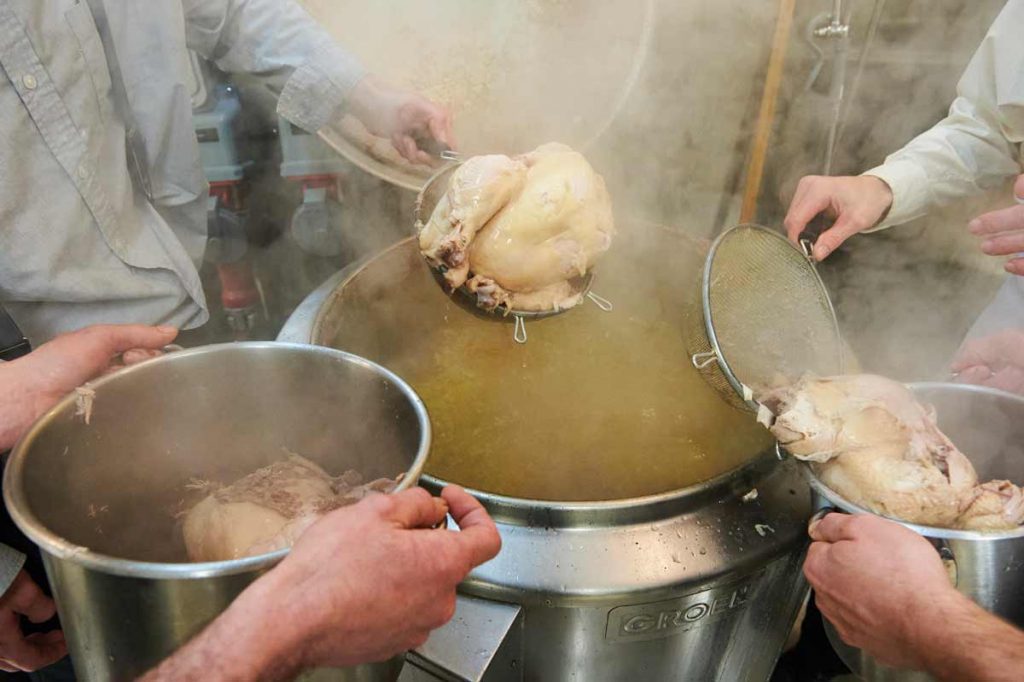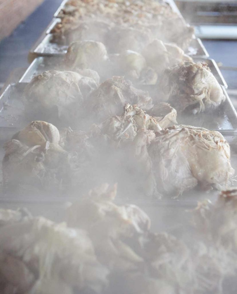 On this particular morning, the temperature is in the teens, allowing the chicken to begin chilling immediately. The broth is captured in food-grade buckets and chilled outside in a specially built trough with cold water flowing through it. Impressively, in a mere 45 minutes, the broth’s temperature drops from near boiling to 60 degrees and falling.