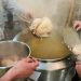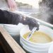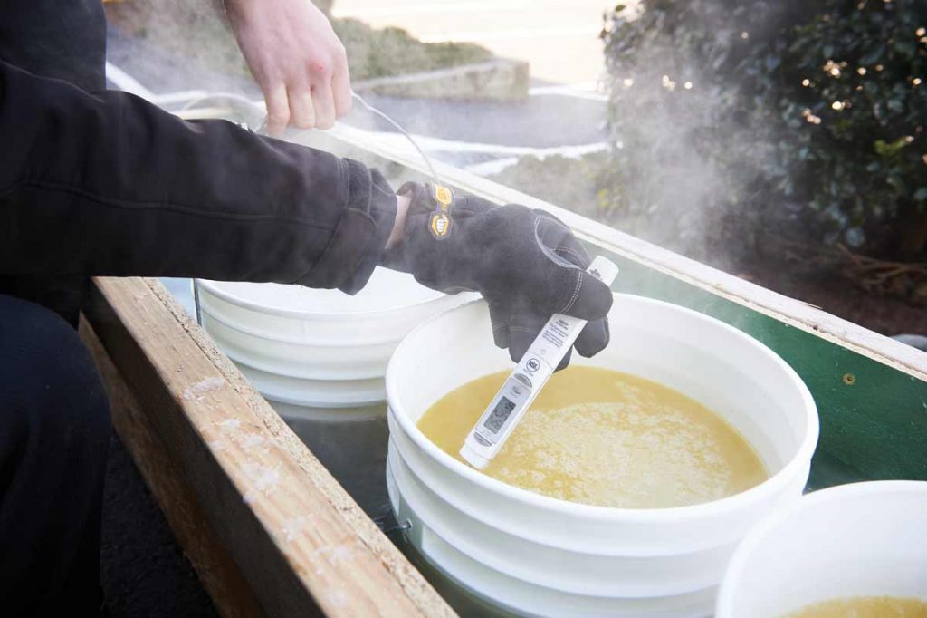 Chicken broth is captured in food-grade buckets and then is chilled outdoors in a specially made trough through which cold water moves. On Saturday morning in February 2020, the ambient temperature is in the teens, enabling the broth to quickly cool.