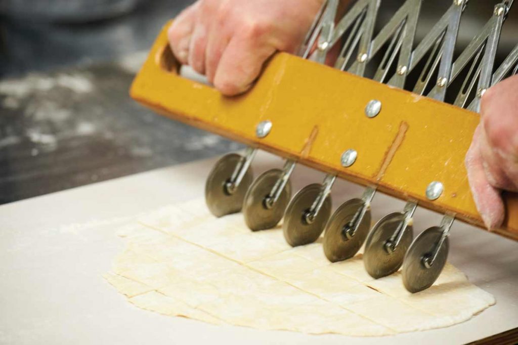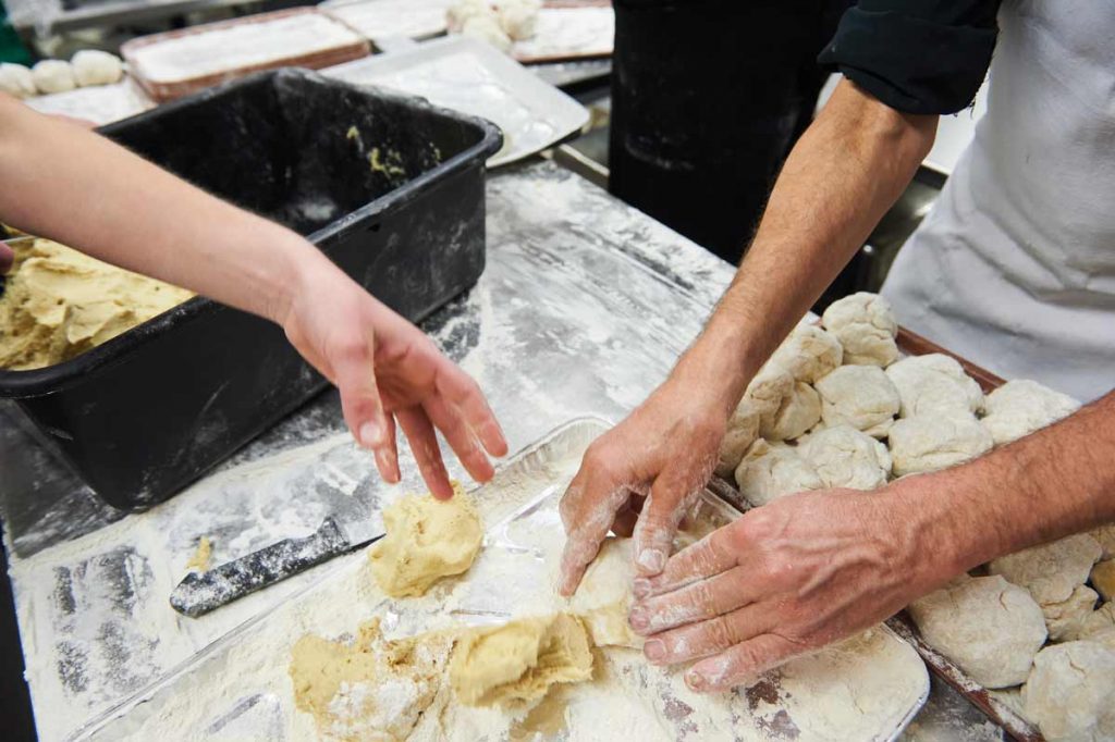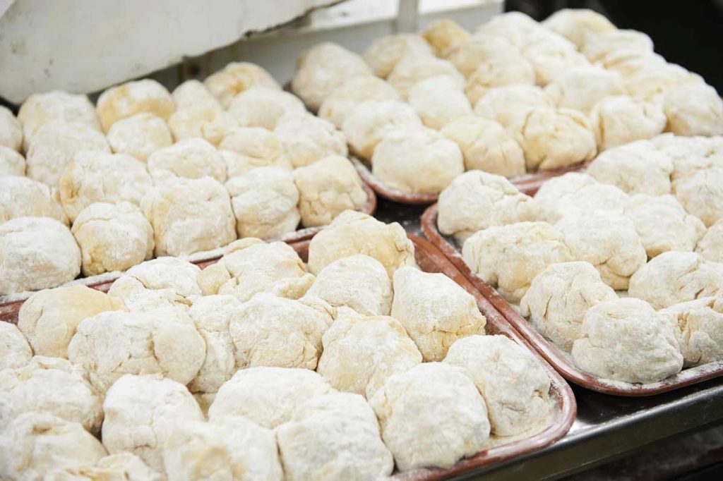 Pastry for the chicken pot pie is made on-demand on the day of the dinner. Hand-rolled balls of pastry await being rolled out and then hand-cut.