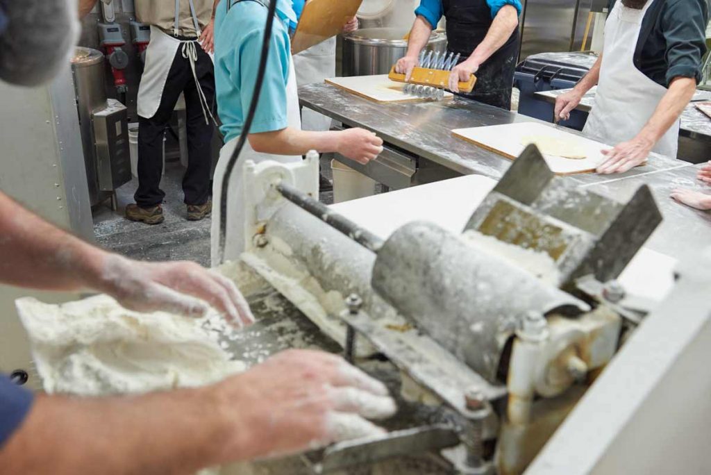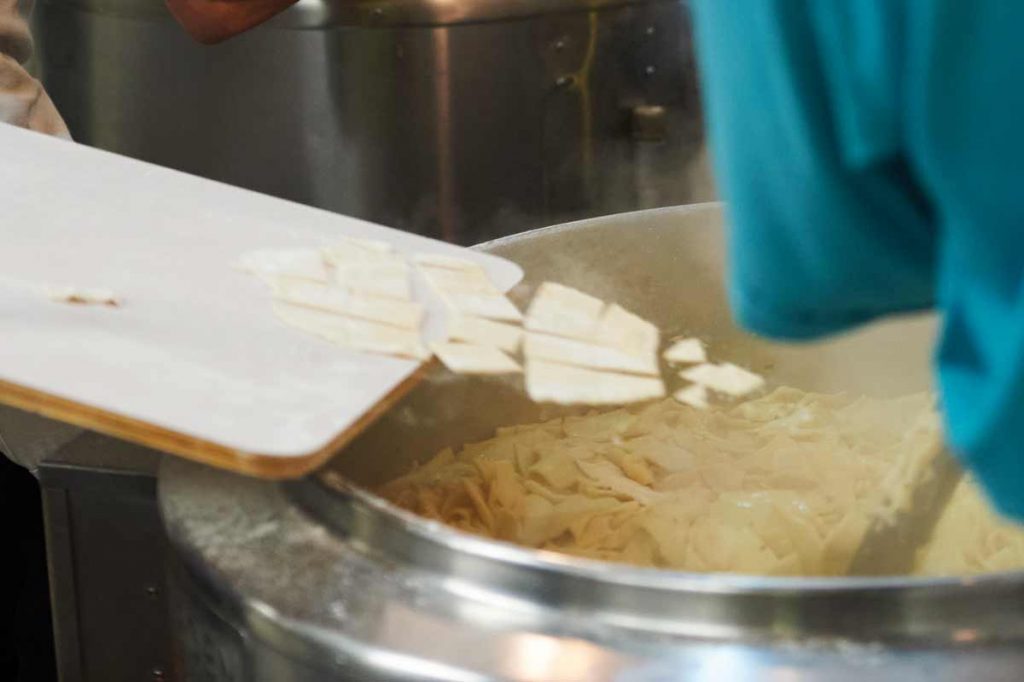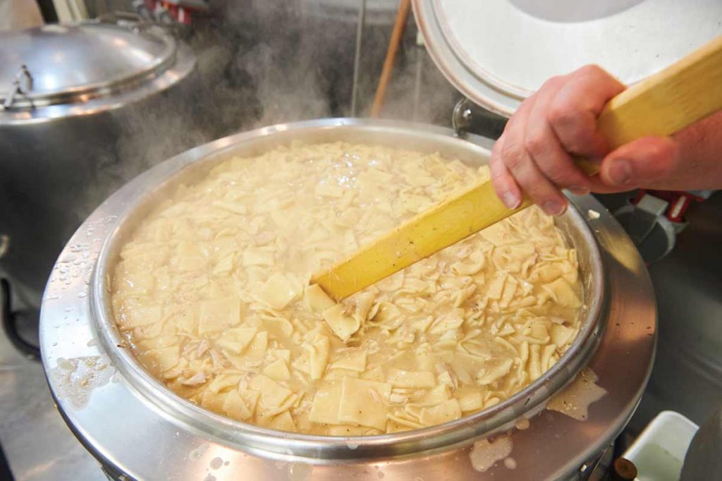 A week later, Saturday’s dinner starts to unfold. In a kitchen filled with gas stoves, a group of women prepares the potatoes and side dishes, including a crowd favorite, pepper cabbage. An assembly line of men prepares the dough for the three, 40-gallon kettles rolling with broth and the makings of chicken pot pie. In a previous year, the volunteers prepared the dough two days in advance of the dinner, only to be dissatisfied with the quality it yielded. Therefore, nearly 20 large batches of dough will be rolled, cut and cooked on-demand with amazing proficiency.