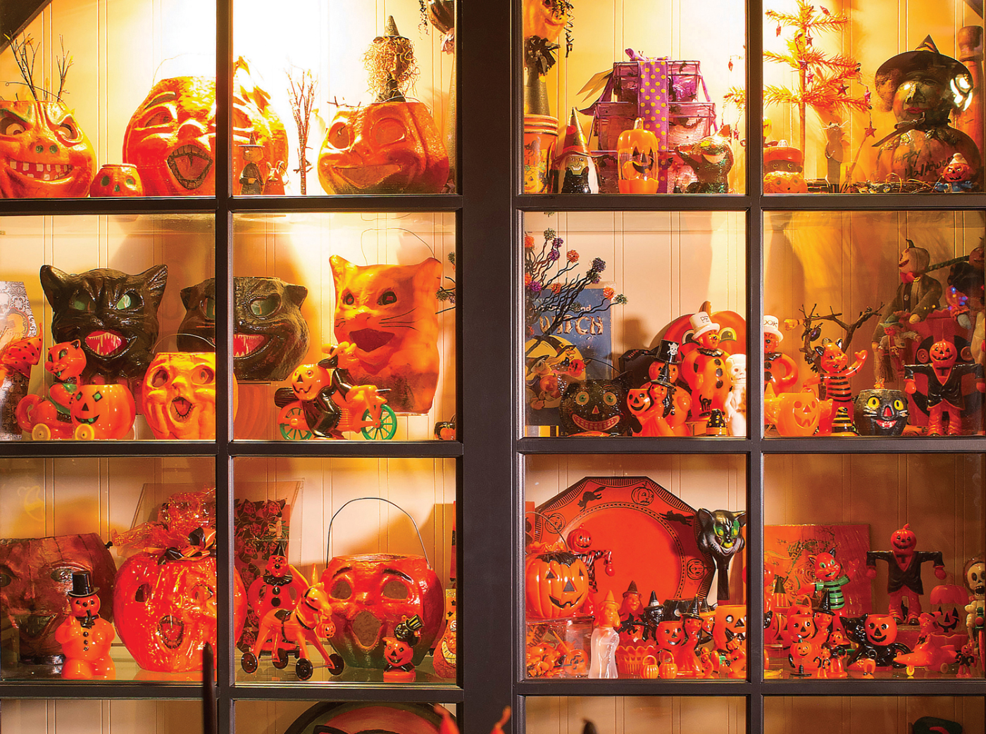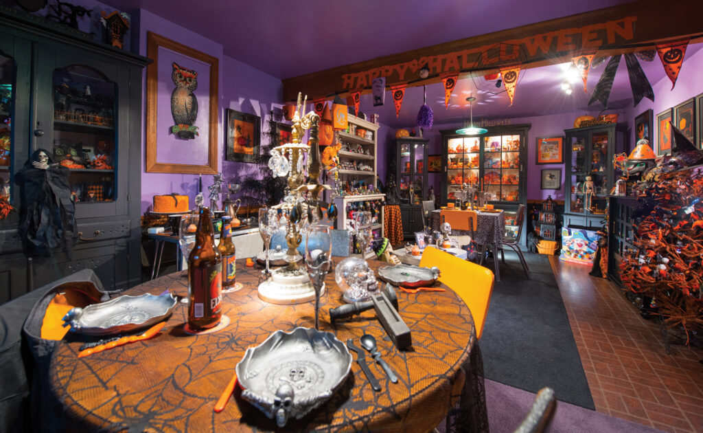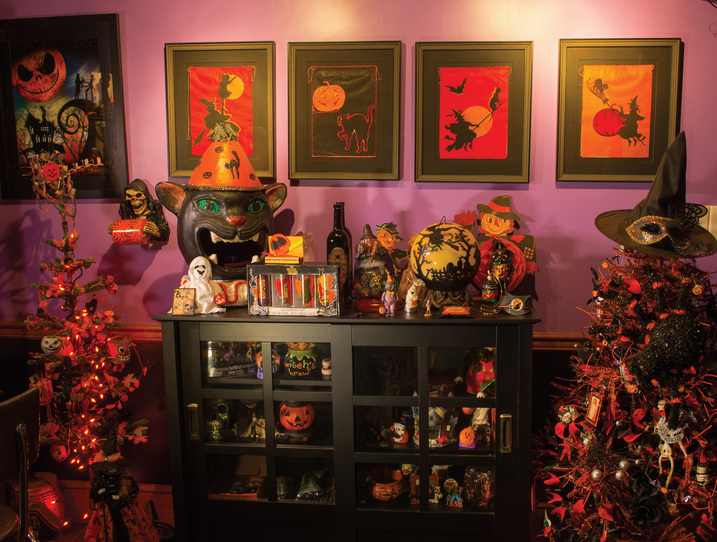 Each September, the Brubakers prepare for Halloween by devoting three weeks to inspecting and cleaning the items in the Halloween room, rearranging the displays and squeezing in new finds. The room is literally bursting at its seams. “There’s no more room for another table or cabinet,” Denise says.